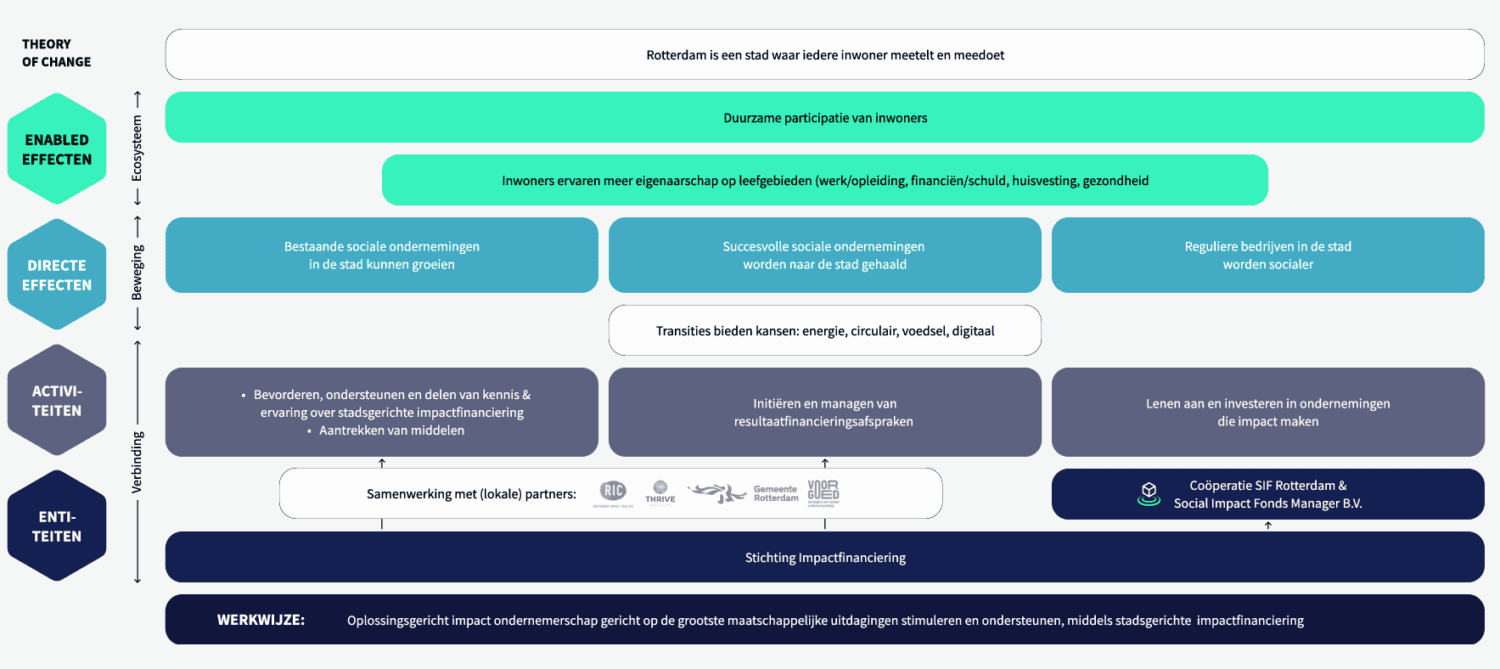 Onze investeringsstrategie gaat hand in hand met onze verandertheorie. Dit impactmodel is opgesteld in samenwerking met Impact House by Grant Thornton en Impact Centre Erasmus (ICE). Aan de hand van deze kaders toetst SIF Rotterdam haar werk en investeringen.