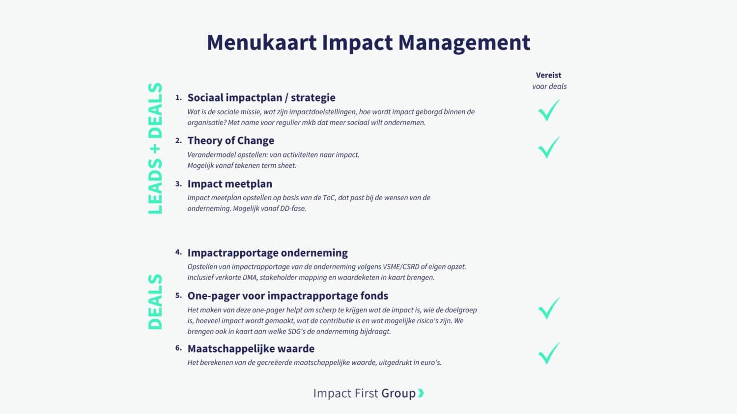 Op het gebied van impact management kunnen wij (potentiële) portfolio ondernemingen ondersteunen bij: