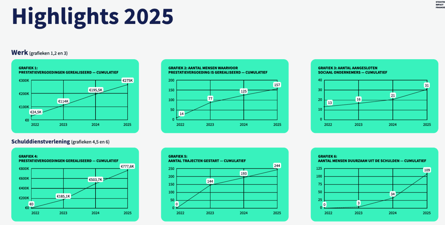 Door met alle betrokkenen in gesprek te gaan en te luisteren naar hun uitdagingen en behoeften, hebben we een model ontwikkeld dat nu aantoonbare resultaten oplevert: meer dan 150 Rotterdammers hebben weer een plek gevonden op de arbeidsmarkt, 240 Rotterdammers zijn bereikt voor schulddienstverlening die anders buiten beeld zouden blijven en meer dan 30 sociaal ondernemers zijn betaald voor deze impact.